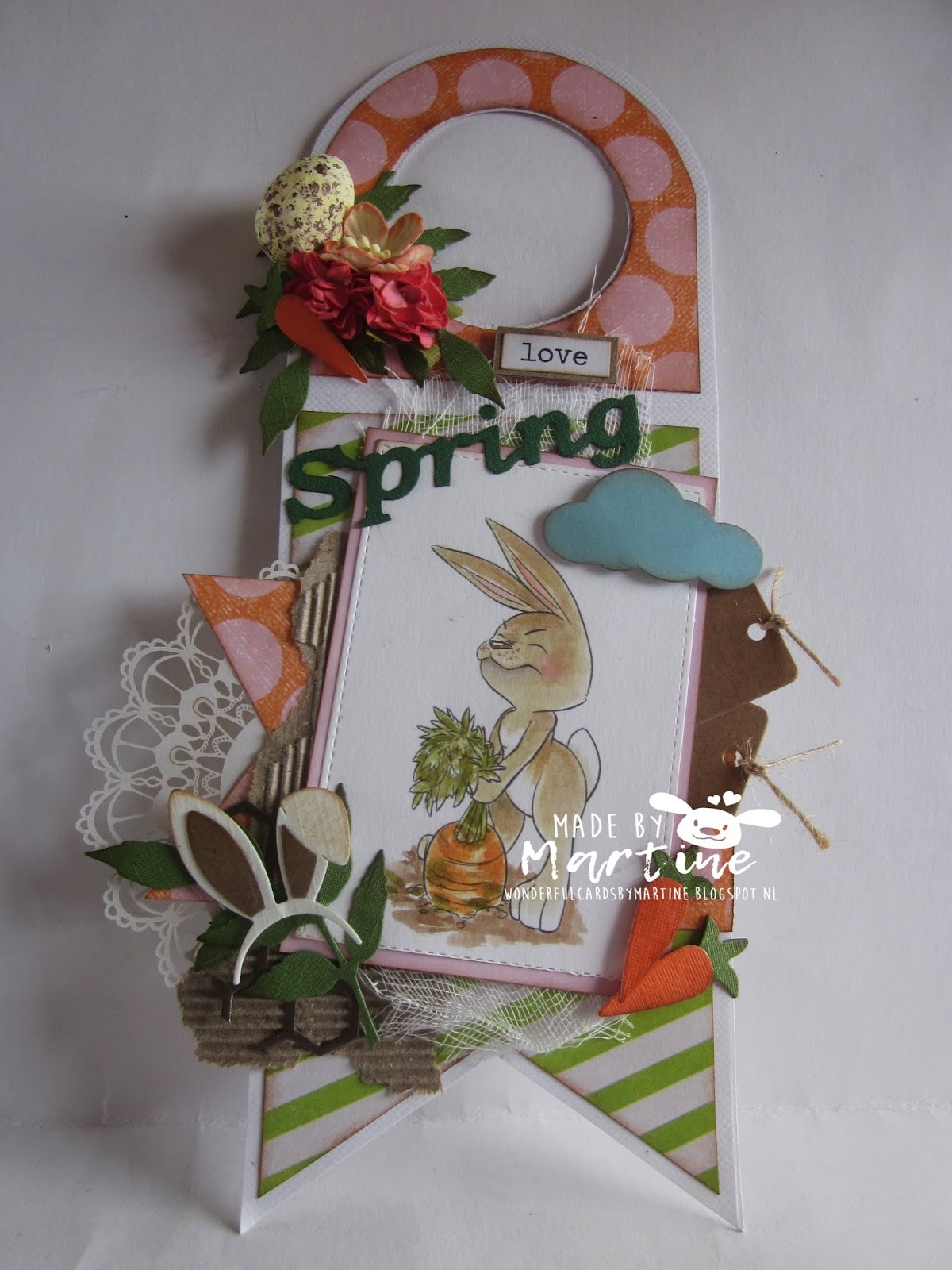Ook hier weer zo'n lief konijntje gebruikt van Some Odd Girl genaamd Esther Bunny . Het woord Spring heb ik al zo lang...geen idee van wie hij is....De bloemetjes zijn het hartje van de Poppy-bloem , van Marianne Design .